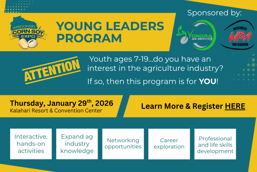 The second annual Young Leaders Program will take place on Thursday, January 29th, 2026, in conjunction with Wisconsin’s Corn Soy Expo at the Kalahari Resort in Wisconsin Dells. This event is geared toward youth ages 7-19 who are interested in agriculture, specifically the swine, corn, and soybean industries.